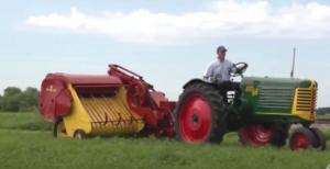 Lano’s 1281 has a 172 cu. in. Ford industrial engine that was also used in Ford tractors. It has many options used on current balers, including a super sweep pickup that raises and lowers hydraulically, an automatic bale tensioning system with top-mounted knotters, and a 1/4-turn bale chute used when the bales are picked up with a bale wagon. The full suspension seat is like those on Oliver tractors. Lano says “the platform is large enough so the driver can operate the foot controls and steering while sitting or standing. The 3-speed transmission is just right for field baling and road travel.”
