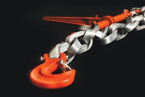 Textile chain lengths of more than 60 ft. can be handled by one person. Conventional binders and other steel chain components can be used to shorten or work with the textile chain. However, the company has used Dyneema fiber to make a DoRa ratcheting load binder. It’s 25 percent shorter than a standard load binder, but can extend twice as far. It eliminates the need to detach and reattach chains when tensioning cargo and fits into tighter spaces.