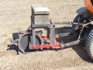 He found a no-till planter framework at a farm auction. He realized it would make a good mount for the dibbler wheel and was just the right width for the electric 3-pt. lift arms on his 1974 Sears garden tractor.