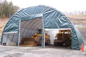 Northeast Shelters operates its own sewing division. Tarp material varies from 5-year to 30-year tarp. Fabric can be UV treated and is available in 10-oz. to 24-oz. vinyl or can be special ordered up to 30-oz. vinyl.