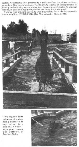 "Free swimming is not much help to a horse, so we do ætail-tie' swimming where a ring is attached to his tail and he's suspended in the water. This forces him to tread water and exercise his legs vigorously. We figure four minutes of this kind of exercise is equivalent to a one-mile race," she says.