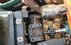 Making a transmission to use with the engine was another big challenge. A machinist friend helped Kedrowski use a T-style angle gear transmission to get the correct direction to the 4-speed Chevy transmission. They mounted a split socket on the inside of the flywheel, plus a chain guard for safety. At the end of the angle transmission is a chain coupler that marries the two transmissions together. A custom-made stub shaft holds the Chevy flywheel in the original truck transmission.