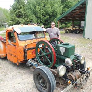 Truck Powered By Hit & Miss Engine ENGINES Combine a 1949 3/4-ton pickup frame a 1950 truck bed a 1969 truck cab and a 1908 hit and miss engine and you’ve got Barney Kedrowski’s Barn Rod He described the process of building it in a detailed article in the July 2021 issue of Farm Collector magazine The one-of-a-kind truck with its 1 200-lb 5 hp engine shakes up every car and tractor show it is trailered into “I’ve shown up at a show with no class for my truck said I’m just here for a good time made a $10 donation and left with a trophy for the most amazing build ” says Kedrowski He credits a local hobbyist who repowered a B John Deere with a 7 hp Witte throttle-governed engine “The guy was an absolute king on his machine ” says Kedrowski “That’s where I came up with the idea to put a 5 hp John Lauson Frost King engine on a truck frame ” The base for the project was a 1949 Chevy 3/4-ton pickup He stripped away the engine and radiator as well as the cab and rear bed Challenges started with the hit and miss engine Smooth and soft when firing at low rpm’s the engine shook its display trailer at higher rpm’s A friend suggested that early flywheel cavities were oversized for balancing Using the friend’s balancing jig Kedrowski tested the engine out on the truck frame He ended up adding 8 lb of lead to each flywheel At the same time he added four extra leaf springs to each side of the front axle to carry the weight of the engine and two transmissions Making a transmission to use with the engine was another big challenge A machinist friend helped Kedrowski use a T-style angle gear transmission to get the correct direction to the 4-speed Chevy transmission They mounted a split socket on the inside of the flywheel plus a chain guard for safety At the end of the angle transmission is a chain coupler that marries the two transmissions together A custom-made stub shaft holds the Chevy flywheel in the original truck transmission Another challenge was the cab Kedrowski had originally purchased a 1969 Diamond Rio dump truck cab when planning to build a pull-truck However it was smaller than the Chevy cab To accommodate the steering wheel now against the door he cut and narrowed the frame At the same time he added a rear notch to the frame to level the cab with the front axle “I also shortened the Pitman arm which helps provide easier steering ” says Kedrowski A big question was whether or not the 1949 starter could turn over the big engine “To our amazement it worked better than expected ” says Kedrowski To make the truck look like a hot rod he cut the floor out of the cab and settled it over the frame That required a subframe made of 2 by 4-in steel tubing to hold the cab square so the doors would function The box from a 1950 Chevy pickup was salvaged from an area junkyard He modified a Ford tailgate to fit the box with the truck’s name in forged steel letters It spells out BARN ROD “Everyone asks how fast it goes ” he says “I tell them ‘I am very proud to tell you that 10 mph is too fast to drive in a tractor parade ’” Contact: FARM SHOW Followup Barney Kedrowski 1331 Highland Ave Wisconsin Rapids Wis 54494 ph 715-213-5369; barneykedrow@gmail com; www facebook com/barney kedrowski