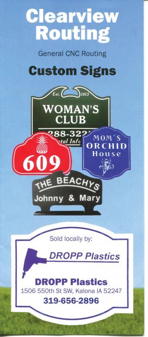 “The company laminates three colors together so the center color stands out where the CNC router cuts out the letters,” says Ropp, owner of Dropp Plastics in Kalon