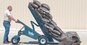 The basic Ox has a footprint of 78 by 33.5 in. and a height of 48 3/4 in. The 14-ga. steel, 30-degree, slotted bed carries up to 1,000 lbs. of bags, bales and more to the worksite. An electric actuator controls unloading as it lifts the bed to a near-vertical position. Add the 10-ga. steel, 34-in. wide wheelbarrow attachment and carry about 10 cu. ft. of loose material as well. Several other attachments designed for the landscape and nursery industries make the power unit even more versatile. All attachments use a hook-in-slot design.