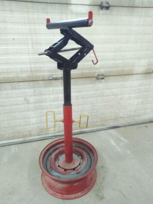 The 2-part vertical leg is a 2 3/8-in. O.D. pipe butt welded to a steel plate that is in turn welded to a 15-in. car rim base. A slightly smaller upper leg pipe slides inside the larger pipe. The scissors jack base is welded to the top of the inner pipe.
