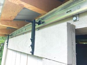 First, he cut the track to the length he needed, then welded 6-in. brackets every foot to secure it with lag screws above the doorway. On the doors, he used three stair-stepped thinner pieces of metal to give a stylish look. He drilled a hole in them for the track wheel axles to slide through and then put everything together on the track. When it was in place, he tacked a small weld on the pin to hold it secure.