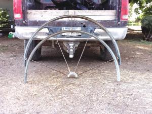To make the hump, he took a half section of a spare wheel and bolted it on the outside of a wheel, so it acts like a cam to let the wheel lift. This gives the wheel about a 9-inch rise so the sheep can fit under comfortably. It takes about 3 or 4 minutes to put the hump onto a wheel, and the sheep can go under it to get into the next paddock, and then it only takes 3 or 4 minutes to take it off again.