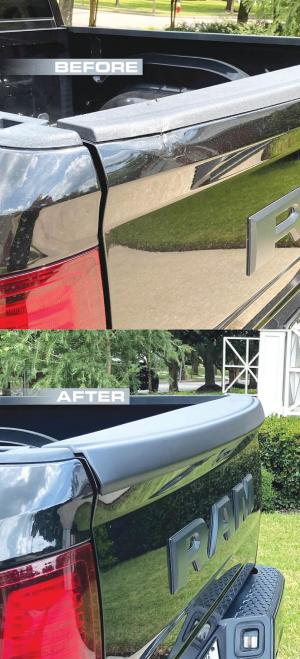 Here goes the Crash: When the tailgate is lowered, that bulging edge is very susceptible to whamming into a trailer jack. (Ask us how we know.) Our tailgate protector has a lip that wraps over the face of the bulging tailgate, protecting it when it crashes on to the tailgate. It also works great for covering up dents if you have experienced that same crash problem. We’re offering a way to save your tailgate.