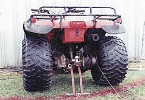 An arched jack stand pins in place beneath the drawbar or under the rear axle, and a heavy-duty spool mounts on the axle just inside the back right wheel. You run the cable out to whatever you want to tow, pulling out only as much cable as you need. Then you drive slowly forward with the winch spool locked until the backward pull by the object being towed pulls back on the ATV enough to force it up onto the jack stand, which then slightly lifts the back of the ATV off the ground so the rear wheel can turn, reeling in whatever you're trying to move.