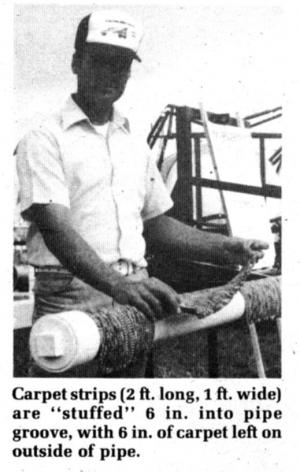 Yocum bought 3-in. dia. plastic pipe (180 in. long to cover six 30-in. rows) and used his power saw to cut a groove the entire length of the pipe. He bought carpet from a local store, cutting it into strips 2 ft. long and 1 ft. wide. He stuffed 6 in. of each strip into the groove and left the remaining 6 in. hanging out, then sealed the groove with glue. The carpet strips are positioned so the threads point toward the ground so they wick better in moving liquid from inside the pipe and through the carpet.