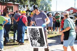 The big steam engine is stored at the show, and Gross or Heerdt drives it to the demonstration site where its 4-ft. wide front wheel is scraped and wiped clean of any debris. A large board placed in front of the wheel is swept clean, layers of paper are put on, and the inked linoleum is laid on top. The drivers slowly inch the 12-ton steam engine roller over the linoleum, then back it off. Volunteers lift the linoleum off the paper as wide-eyed show visitors see the image revealed. Heerdt says they roll 20 to 25 prints a day over the 4-day show.