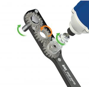 The Anex offset socket extension lets you use your power ratchet/driver in places it wouldn’t otherwise fit. It’s just over 9 in. long, less than 2 in. wide and only 3/8 in. thick, so it gets into tight spaces. The gear drive power transfer is also handy for use with pass-through sockets on threaded rod or long bolts.