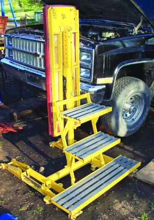 Robert Greenwood of Bellwood, Neb., has engineered a solution to inaccessible vehicles. “Pickups are so tall now that I can’t service them from the ground,” he explains. “So, I took two bad floor jacks, some steel, a fiberglass step tread, and a folding tall creeper that allows me to adjust the height for any of the trucks and walk right up to work or get to a dipstick.”
