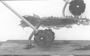 It consists of two rolling metal discs with a ripper above and a Dutch hoe below.