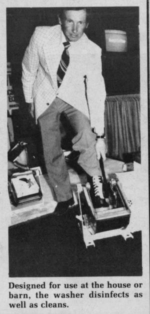 Boot Cleaner,Sanitizer FARM HOME Clothes 7-3-30 Unlike a flat pan or tray you step into, the new Sani-Boot cleaner-sanitizer from Wulf Development Co. is easy to keep clean. It fills with fresh water and disinfectant each time it's used and can be heated for freeze-proof operation during winter months.
