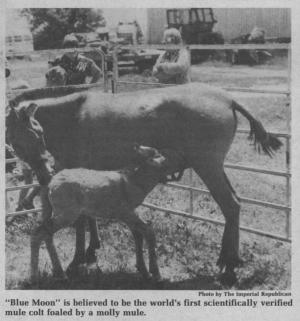 Blood samples and other "technical testing" have verified that Blue Moon is indeed the first scientifically verified mule colt foaled from a mulemolly. In mid-August, the Sylvesters received word from Dr. Benirschke with the big news: Krause is a true molly mule with 63 chromosomes and her new son Blue Moon is also a mule with 63 chromosomes. The father and grandfather is a verified jackass with 62 chromosomes, and the grandmother a true female horse with 64 chromosomes.