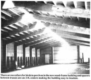 The internal design of the new-style truss is the key to its success. "Nearly all the major farm building manufacturers have approached me about buying my truss to use with their buildings but we won't sell because we've got a unique product. There's nothing else like it on the market," says Meidinger. His truss features internal diagonal webbing - all made out of wood - that gives it the strength to span wide widths and yet still stand up to commercially-rated roof loads. "The widest clear span wood-frame buildings on the market up to now have been about 80 ft. with expensive box-beam type construction. Steel buildings can go wider but they're much more expensive to put up and about three times as expensive to finish off inside."