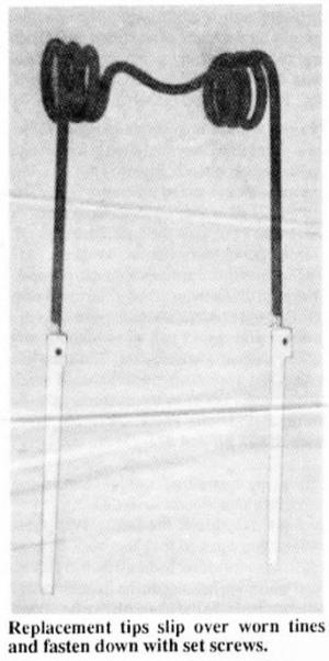 Delyen says you don't have to remove the tines from the harrow bar or cultivator and all you need for installation is a set screw wrench. "One man can rebuild a 5-ft., 3-bar harrow section in 20 min. or less," he says. "You can buy weld-on tips but they're a lot more work and you have to measure to get them the right length. With my tines you just slip them on as far as they go and tighten them down."