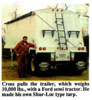 "By building these trailers myself, I've saved 50% of the cost and ended up with a much heavier trailer. I do the building in my spare time," says Cross, who farms 300 acres while working full time at a manufacturing plant. He pulls the trailer with a Ford semi tractor.