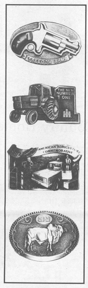 "There are many types of collections," says Wally Miller, a belt buckle collector from Creston Iowa. "Most collectors specialize. For example, my collection of more than 300 consists primarily of ag-related buckles. The charm of belt buckle collecting is that most of the buckles are free or cost under $10. But some of them can get expensive."