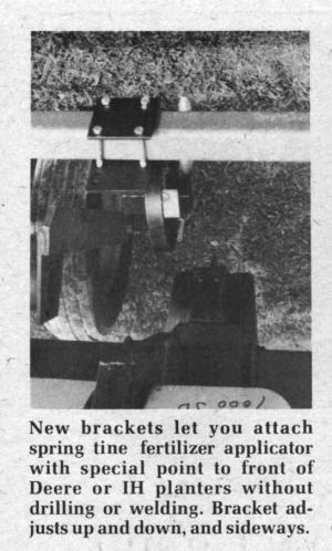 Deep placement planter bracket PLANTING EQUIPMENT Accessories 10-1-34 "Our deep placement bracket and tooth assembly for Deere and IH planters has been tested for over five years. It's the most economical and trouble free way to put liquid fertilizer to the side and just below the seed," says Miles Netsch, Terril, Iowa.
