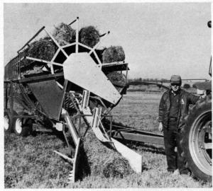 The conveyor unloads bales into an elevator from either the front or rear of the machine. Other key features include: Automatic pickup of round or square bales whether on edge or lying flat; loads in 8 min. and unloads in 2 min.; measures under 8 ft. wide for highway transport; operates on hilly land.