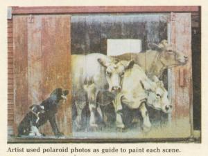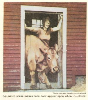 Using closed wooden doors as a canvas, artist Ashley Wolff created the 3-D scenes on the doors of six different buildings on Crawford'sfarm. "First, we took Polaroid photos, using real people and tame, halter-broken animals as subjects. Ashely then used these photos as a guide to paint each scene," Crawford points out. "The fake doors she put into the pictures have an open, animated look."