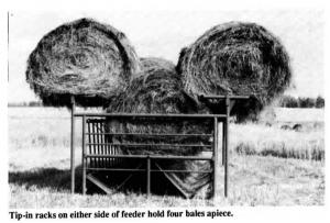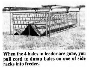 The 24-ft. long, 8-ft. wide feeder holds 4 bales on each side rack. When the 4 bales in the feeder are gone, you pull a trip cord to dump bales on one of the side racks into the feeder. When the second 4 are gone, you simply tip the remaining 4 bales in. The feeder is built from steel pipe.