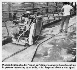 Skid-Grooving Concrete DAIRY EQUIPMENT & IDEAS Dairy Equipment & Ideas 1-2-20 Kenneth Main, of Copake, N.Y., noticed when he was custom trimming hooves for dairymen that concrete floors in free-stall barns become awfully slippery from daily scraping.