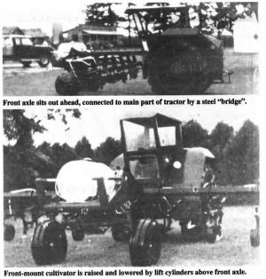 The engine, transmission and other power components are all positioned under or behind tractor cab and rear wheels. The front axle sits out ahead, connected to the main part of the tractor by a 7-in. sq. steel "bridge.