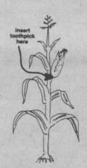 While the cornsilk is still green, drive a round toothpick through the base of the ear stem and into the main stem just above the joint (See sketch).