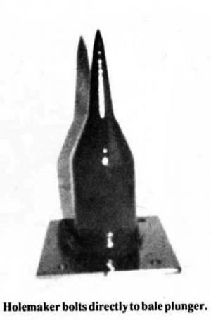 The holemaker bolts directly to the face of the plunger. It requires no other modification to baler. Sells for $149.50 and is available in two models. One has a, ready-made mounting plate that simply bolts in place on Deere balers. The other model, designed for all other square balers, has a 4 by 4-in. mounting plate that you simply center on the plunger and drills holes to bolt in place. Recker is also working on a bigger model that would make a 5-in sq. hole in bales.