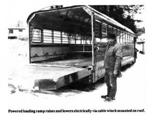 He made the powered rear door and loading ramp by cutting off the back of the bus and making a heavy wooden door that fits the opening. It hinges on the rear bumper and a cable winch - mounted on the roof of the bus - raises and lowers the door. He mounted a 12-volt battery under the rear of the bus to power the winch. The battery is charged by the bus's main generator. A switch mounted on the side of the bus controls the door.