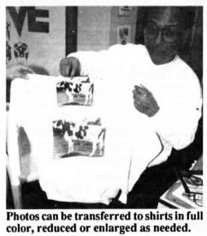 Bev Wilkins, who imported the new photo imaging machine, says that because the image is printed directly onto the fabric of the clothing, it can't rub off or come loose the way iron-on patches can, and the clothes may be washed normally without washing out color. The company can also customize any shirt with lettering in many different styles. I