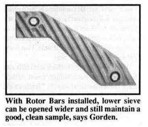 The threshing action increases as more Gorden Rotor Bars are added. As many as 20 can be installed on the 1680, and up to 15 on the 1640, 1660 and 1670. "In most instances, as few as 12 Rotor Bars on the 1680, or 9 on the 1640, 1660 and 1670, will get the threshing job done the first time through. With Rotor Bars installed, the lower sieve can be opened Crider - 3/8 in. or more - and still maintain a good, clean bin sample," says Gorden.