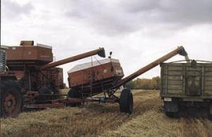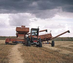 The add-on hopper gives Riopel more time between unloading. He says it has an-other unexpected benefit: "On soft ground, you can divide your load between the two hoppers so all weight is not on the combine. This way you can get through a lot more mud. It also makes the combine pull straight on muddy ground. You don't get the side draft you normally get with a pull-type combine."