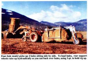 Vickaryous has also built a 2-bale model without rear support wheels. Two sets of hydraulic outlets are needed for the 4-bale model and one set for the 2-bale model. The arms on both models can be adjusted to handle 5 by 5 or 5 by 6-ft. round bales, or 4 by 5-ft. sq. bales.