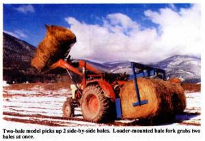 The loader fork is equipped with two spears, one of which is hydraulically operated to "clamp" the two bales together. Another cylinder is used to tilt the bales forward or backward.