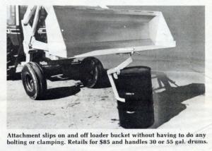 The Barrel-Eze attaches quickly to the cutting edge of any loader bucket. It grips the barrel at the top rim, with additional support below the first rib for safe handling. Since the barrel is nearly vertical during transport, it can be moved either open or sealed. And, the barrel is kept nearly obstruction-free so you can maneuver it easily in close quarters.