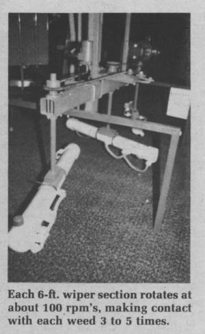 The rope-wick applicator (3 in. dia.) is built in 6 ft. sections, each of which spin in circles like giant-size mower blades as the wiper goes down the field to apply Roundup to t