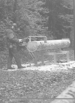Unlike stationary sawmills where the trunk is moved through a fixed sawing frame, a conventional chain saw performs the cutting operation on a stationary trunk. The saw rests on a sledge which is moved along the trunk by hand-crank cable winch.