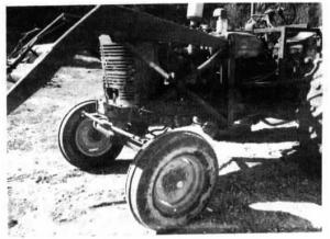 After years of getting stuck when doing loader work with his IH Super M-TA with a narrow front end, Gerald Fedler, Ft. Madison, Iowa, found a way to solve the problem by mounting the steering axle from an Oliver 535 combine on the tractor.
