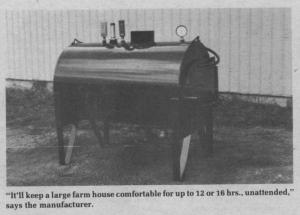 Sells for $1,000 and delivers upwards of 140,000 btu's. "That's enough capacity to heat most farm homes comfortably," says Isane. "We suggest that you leave your existing oil or gas furnace intact so it's there, ready for standby use, such as when you're away on vacation and there's nobody home to feed logs into the outside furnace."