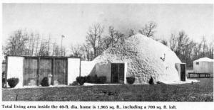 The dome is 40 ft. in dia. and 20 ft. high at the center. It's "fireproofed" on the interior. Total living area is 1,965 sq. ft., including a 700 sq. ft. loft reached by a spiral staircase. It contains a kitchen, living-dining area, four bedrooms, two bathrooms and a utility room.