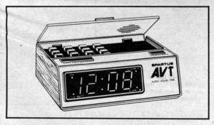 The just-introduced AVT (Audio Visual Time) is made by Spartus. The clock can be programmed to tell you the time and the date in a clear, distinct voice. It also can be set to chime the quarter hour, half hour, and hour.