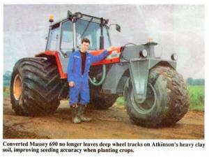 James Atkinson, who farms near Stillingfleet, Yorkshire, mounted Terra tires on the rear of his Massey Ferguson 690. Then he replaced the front axle with a bolt-on single wheel assembly designed to be fitted with a third flotation tire.