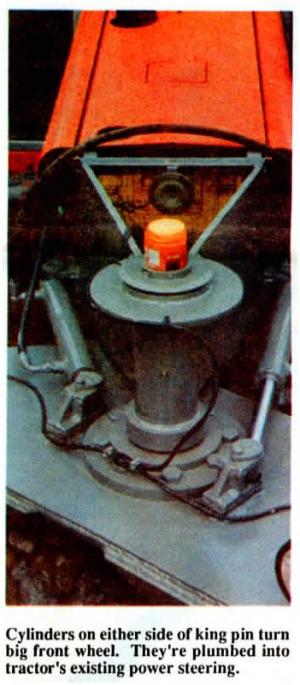 Steering is controlled by a pair of hydraulic cylinders that mount on either side of the kingpin and are plumbed into the tractor's original hydraulic-controlled steering. Atkinson says the tractor steers nearly the same as before the conversion. The front axle came off a potato harvester. Lights mount above the front wheel.