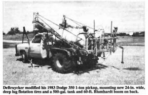 Montana farmer Rudy DeBruycker needed a big sprayer to work his 4,000 acres of small grains. But he wasn't satisfied with conventional pickup sprayers so he modified his 1983 Dodge 350 1-ton pickup, mounting new 24-in. wide, deep lug flotation tires in back (designed for a Hesston self-propelled swather) and a 3-speed