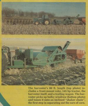 The harvester looks somewhat like a modified rock picker. A drum, about 5 ft. in dia., spins at about 100 rpm's, throwing stalks, ears, and other debris onto an inclined shaker chain mounted behind. The drum is fitted with rows of teeth that rake the surface of the ground. It's important that the pto-powered drum spin at high speeds, according to Miller, so that it won't plug up in the large windrows.